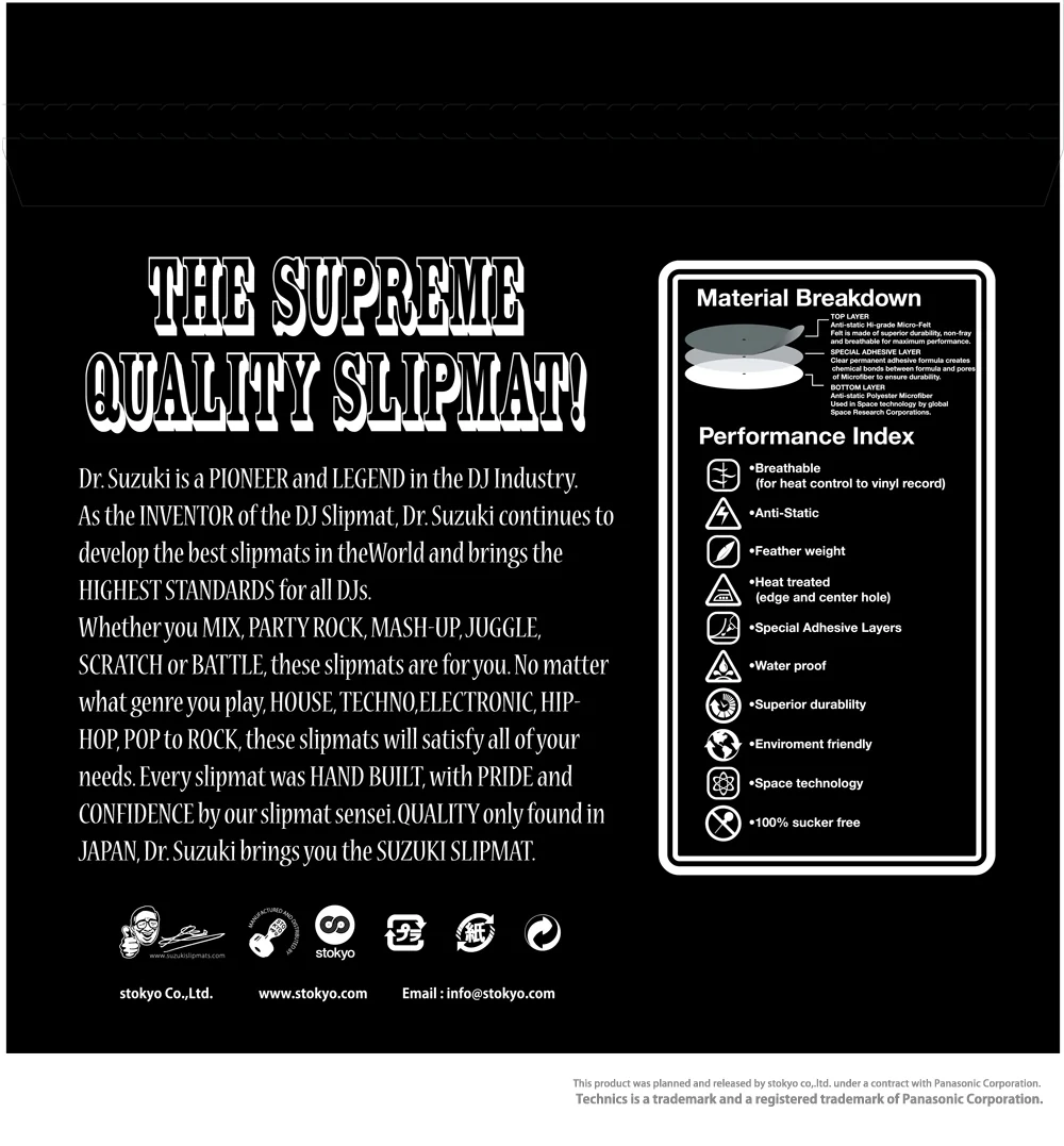 Dr. Suzuki ha sido el pionero del slipmat, marcando la pauta en calidad, rendimiento e innovación por más de 40 años. Gracias a la selección meticulosa de materiales y a incontables horas de pruebas, los tapetes para tornamesa de Suzuki-san siguen garantizando que los DJs estén seguros y cómodos en los 1’s y 2’s.